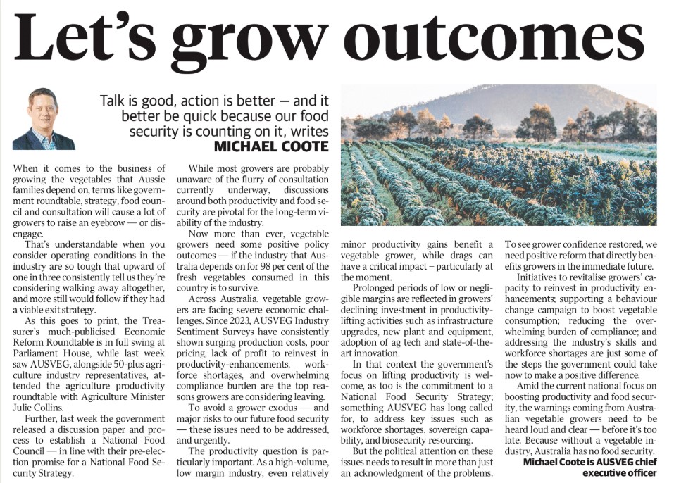 When it comes to the business of growing the vegetables that Aussie families depend on, terms like government roundtable, strategy, food council and consultation will cause a lot of growers to raise an eyebrow — or disengage.
