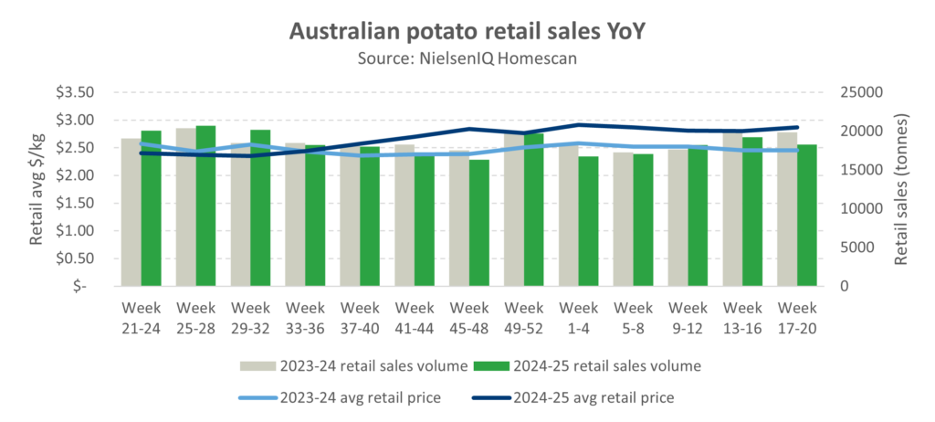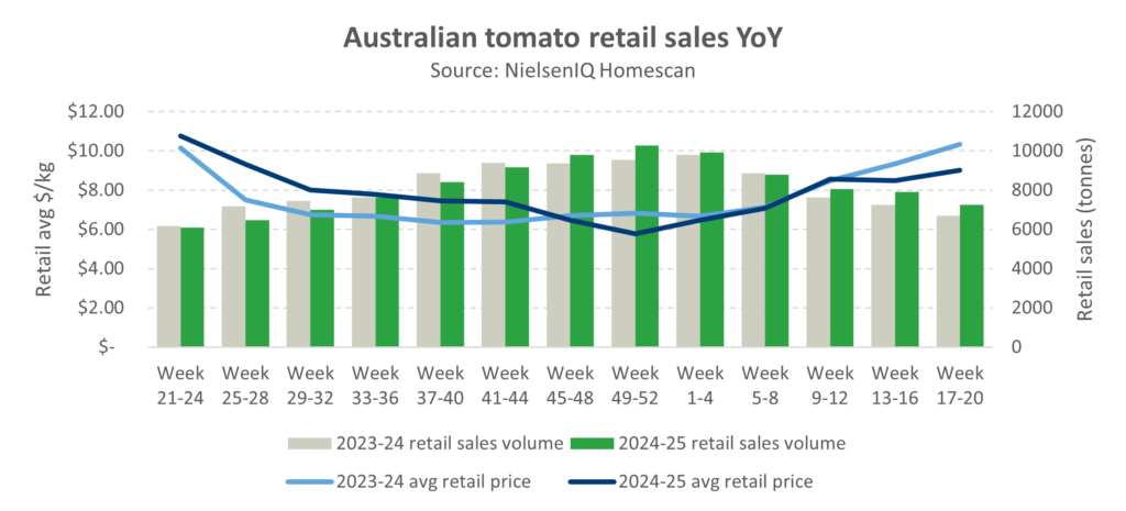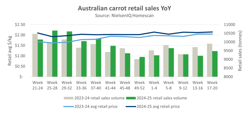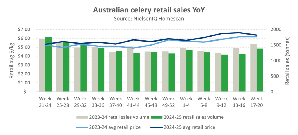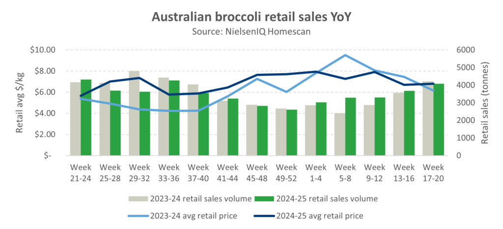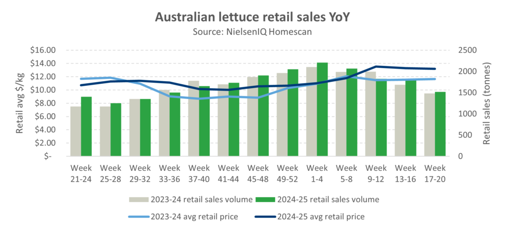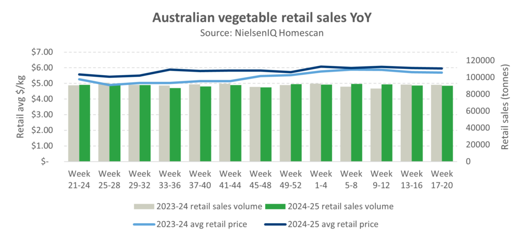 Retail sales volume has also been resilient, tracking very close to the same period in the previous year. In fact, total vegetable retail sales volume is only 0.2 percent lower YoY over the past 12 months, despite prices being 7.2 percent higher. That’s generated an additional $457m in retail sales, according to Nielsen’s figures.