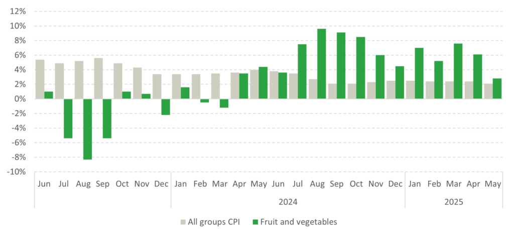 The graph below shows the Australian Bureau of Statistics (ABS) monthly CPI indicator for fruit and vegetables, which represents each month’s percentage change on the same month the year before.