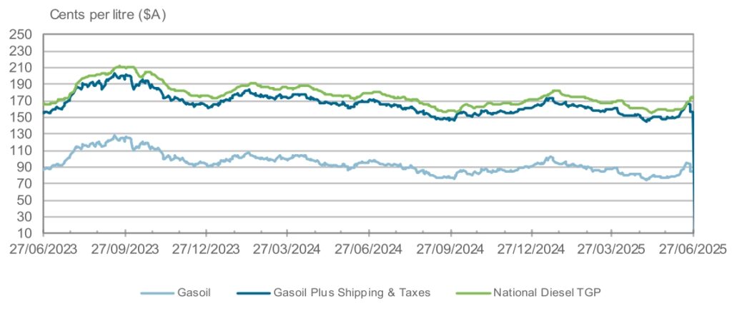 Australian wholesale diesel price (TGP) vs Singapore diesel price (Gasoil) June 2023 to June 2025