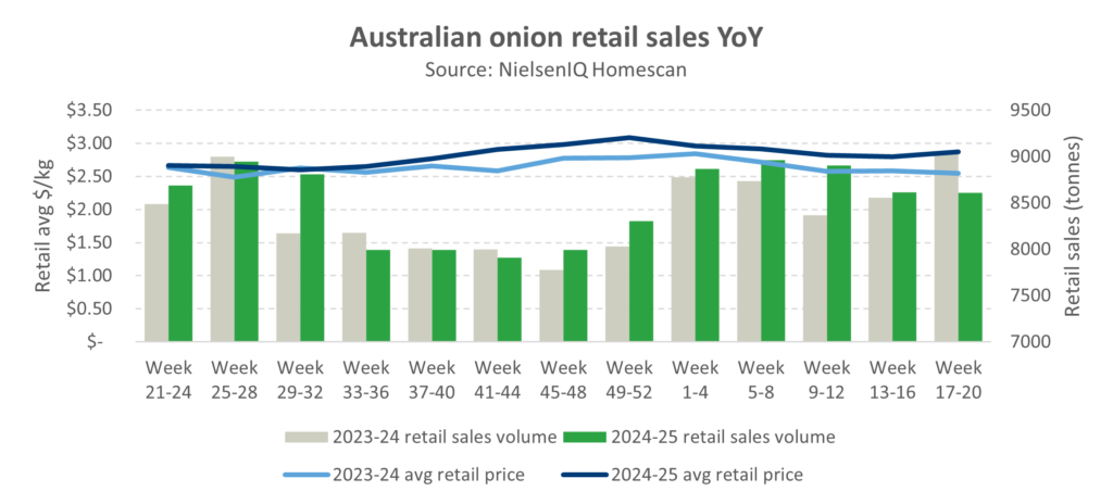 Average monthly vegetable retail prices so far this year have stayed above those 12 months prior, but by a lower margin than the second half of 2024. Average monthly total vegetable retail prices were 4 percent higher YoY, whereas prices in the last six months of 2024 were 10 percent higher.