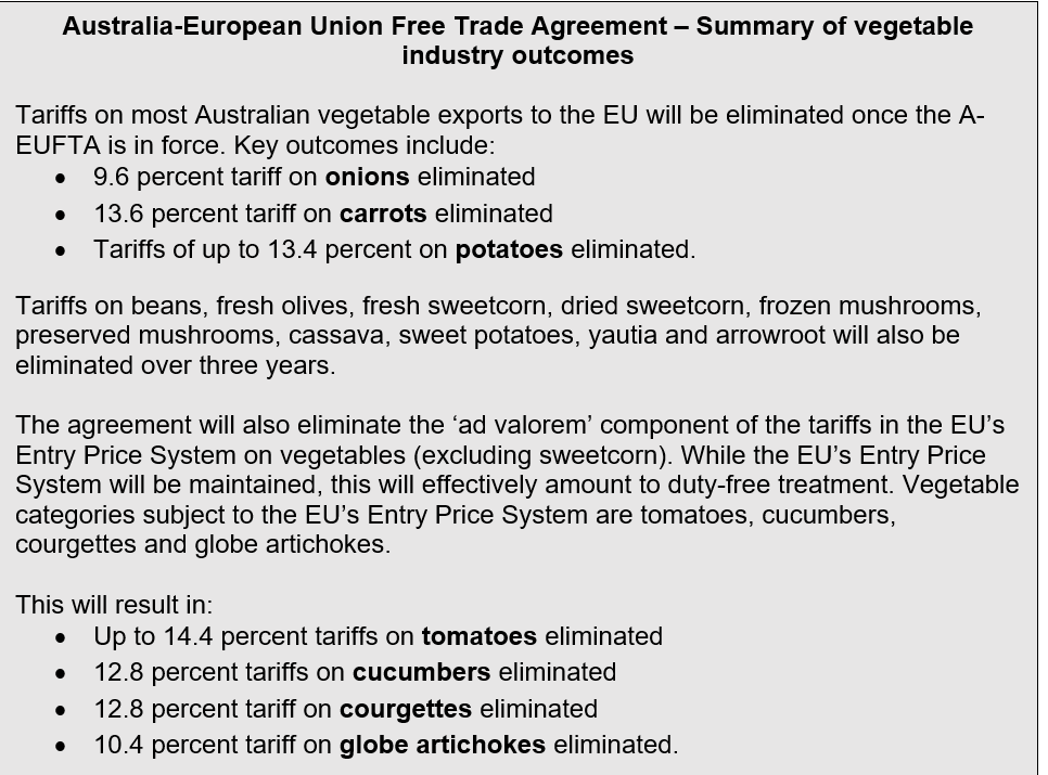 Under the agreement, tariffs on Australian onions, carrots and potatoes exported to the EU will be eliminated, while tariffs on Australian beans and fresh sweetcorn will be phased out over three years.