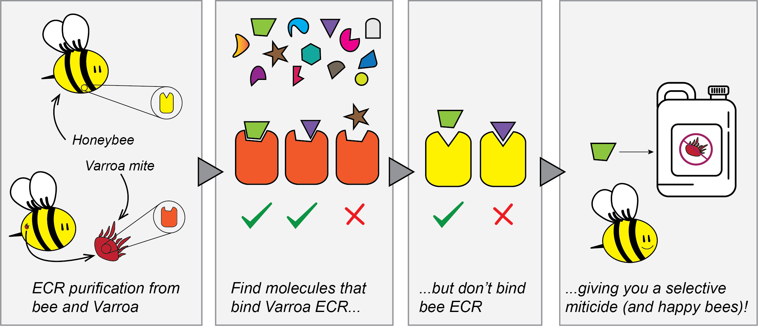 With our target in hand, we have recently commenced the search for chemicals that can hit that target. Our strategy is to search collections of thousands of commercially available chemicals to find that needle in the haystack – a chemical that potently interferes with the Varroa ecdysone receptor but does not interfere with the equivalent target in the honeybee (and so is safe for our beloved pollinators (Figure 1). Excitingly, we have already discovered several ‘hits’ – chemicals that are starting points on that journey. Time will tell whether these starting points can be honed to yield our holy grail: a pesticide that can be deployed against Varroa without harming honeybees.