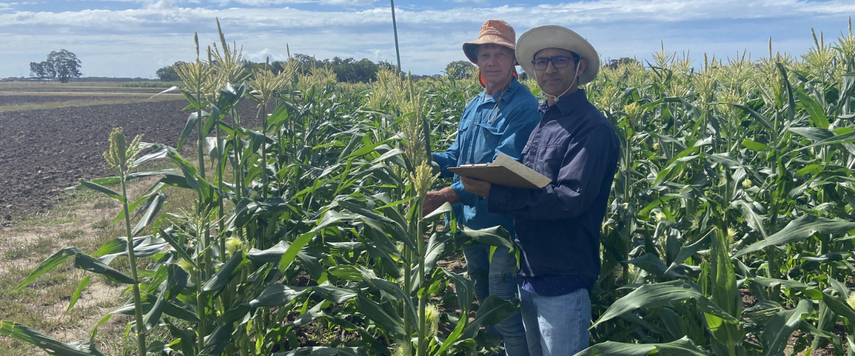 L-R. Dr John Stanley and Dr Ramesh Puri from the Queensland DPI monitoring a fall armyworm management trial in sweet corn at the Bowen Research Facility in August 2025; John and Ramesh are working on insecticide resistance management in fall armyworm as part of the vegetable-levy funded VG22006 project.