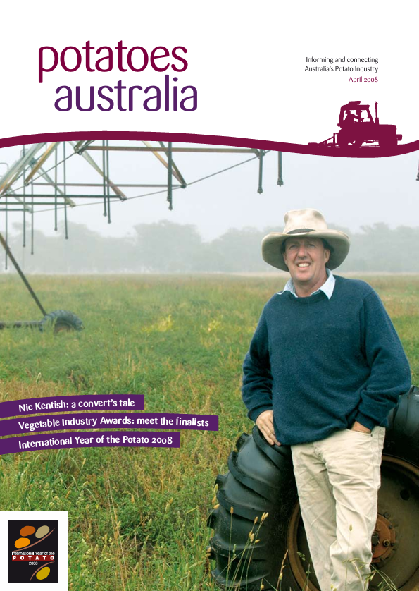 Vegenotes #517 March 2008Vegetables Australia May/June 20081 May 2008 Potatoes Australia April 2008 1 April 2008 Attachment Download FileHome / Potatoes Australia April 2008 Nic Kentish: a convert’s tale Vegetable Industry Awards: meet the finalists International Year of the Potato 2008 Share