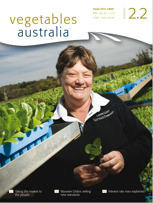Vegetables Australia July/August 20061 July 2006Vegetables Australia November/December 20061 November 2006 Vegetables Australia September/October 2006 1 September 2006 Attachment Download FileHome / Vegetables Australia September/October 2006 Taking the market to the people Maureen Dobra setting new standards Interest rate rises explained Share