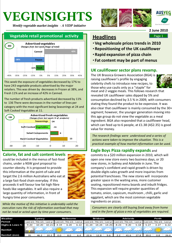 VEGINSIGHTS – May 26, 201026 May 2010VEGINSIGHTS – June 9, 20109 June 2010 VEGINSIGHTS – June 2, 2010 2 June 2010 Attachment Download FileHome / VEGINSIGHTS – June 2, 2010 Veg wholesale prices trends in 2010 Repositioning of the UK cauliflower Rapid expansion of pizza chain Fat content may be part of menus Share
